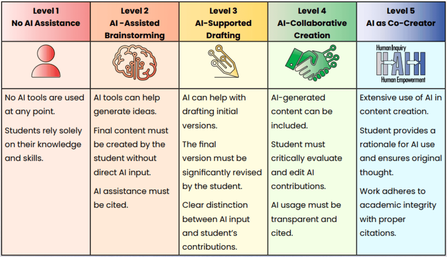 On a website published by the district’s technology department, this language is included alongside a guide to help teachers communicate what level of AI usage is approved for assignments: