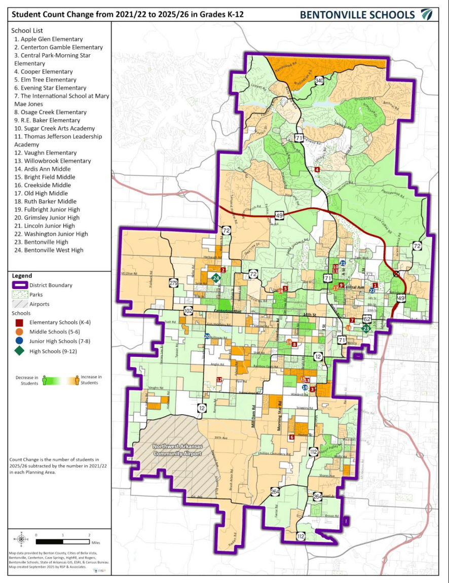 The district’s boundaries cover Bentonville, as well as parts of Centerton, Highfill, Bella Vista, Cave Springs, and a bit of Rogers.