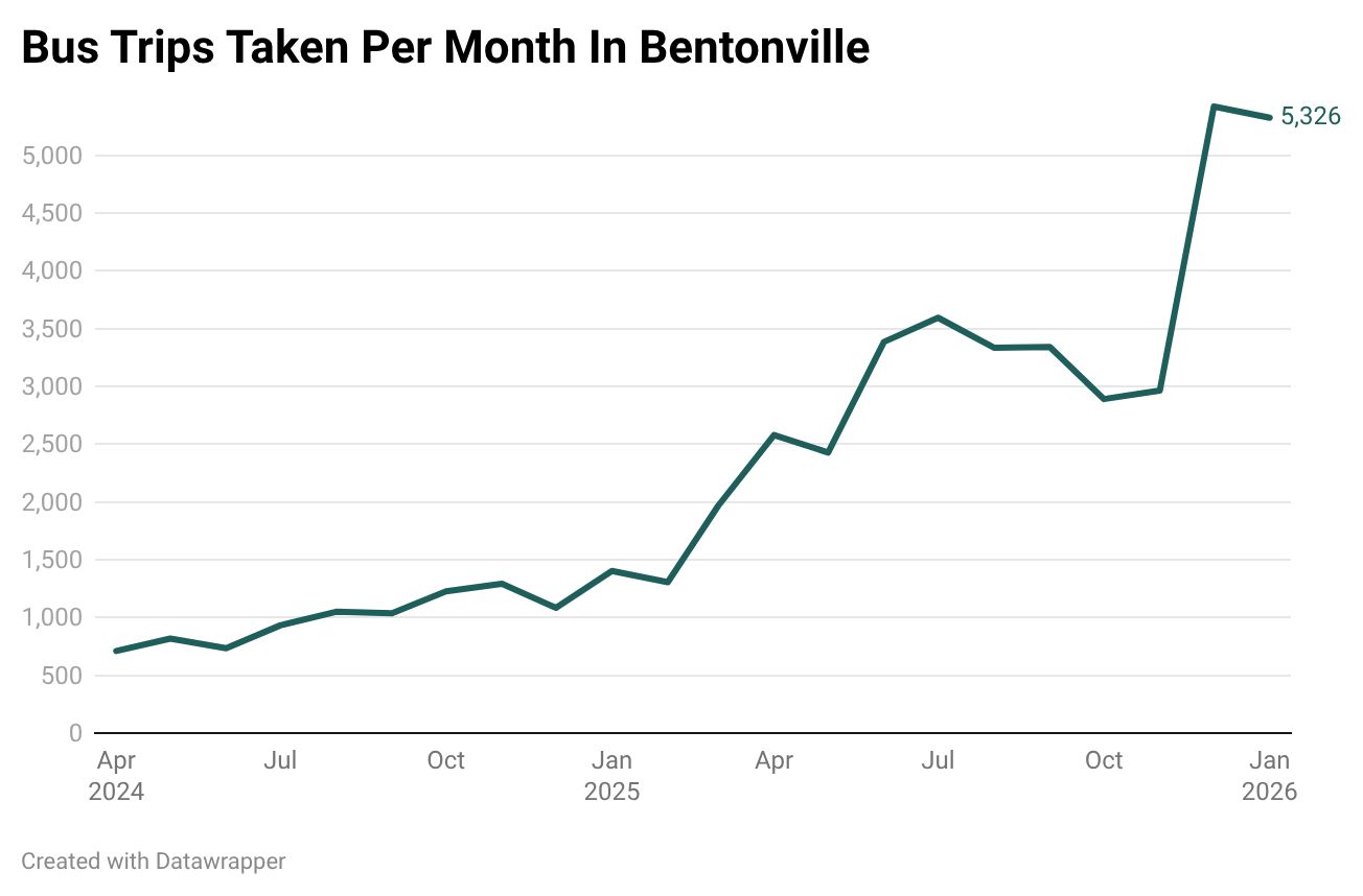 Compared to the overall population of Bentonville, the public transportation system still serves a relatively small number of riders each month, with Ozark Regional Transit reporting just over 5,300 rides in January.