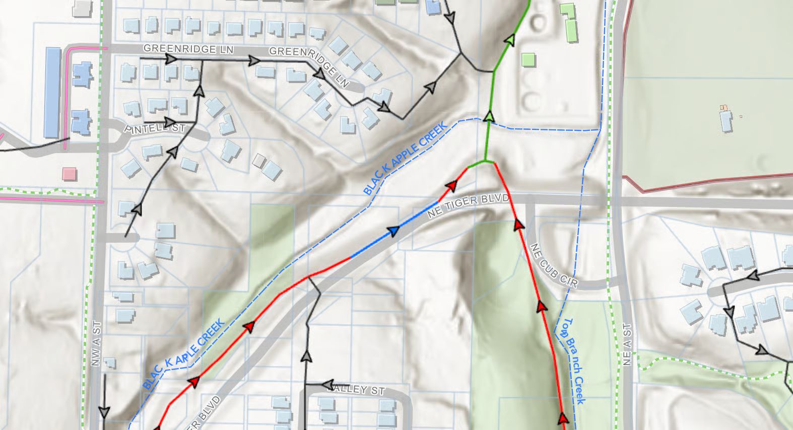 On the map, green indicates adequate capacity, red means the pipe is undersized, and blue shows that an issue downstream in the system is affecting that section. Black lines represent smaller pipes that have not yet been evaluated by the city but will require evaluation if new developments are proposed.